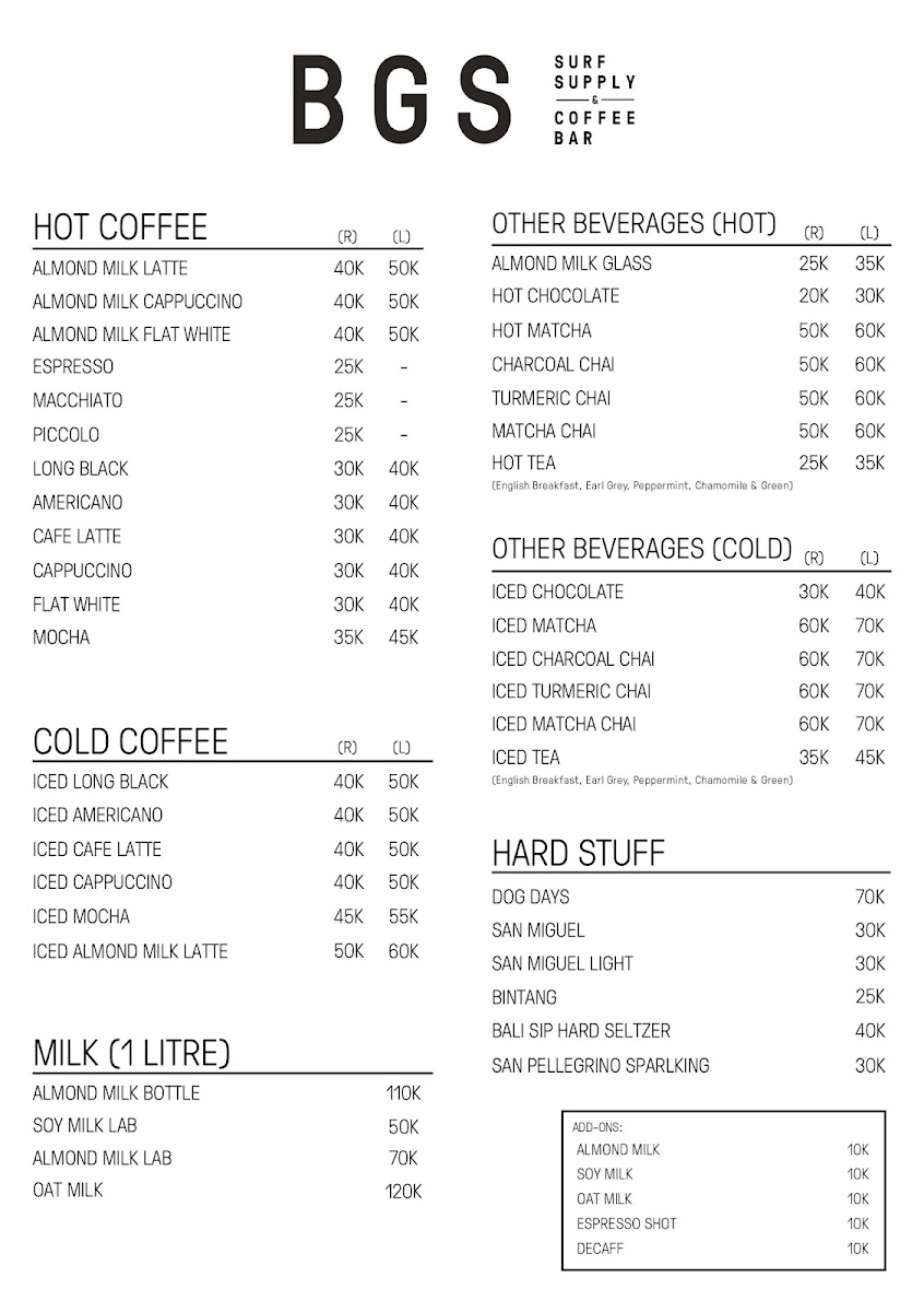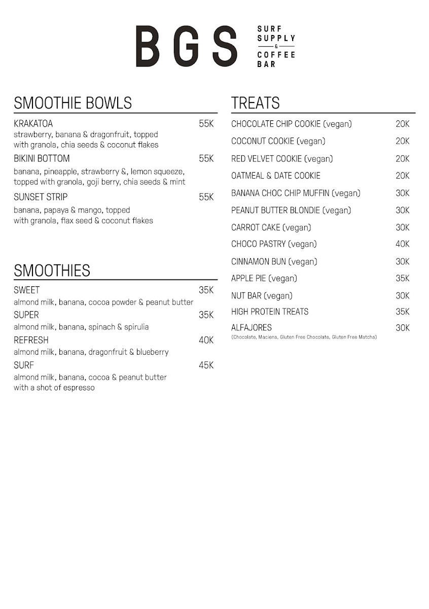 “ -I visited the first BGS store in Pecatu. -They also sell surfing gear and VANS shoes inside (on top of that, The Rip Curl store is right next to BGS). -The almond milk at BGS is different from others; it has a noticeable salty aftertaste -Server was really warm and chatty. -Recommended menu by the staff: Almond Milk Latte (IDR 45.000) ”