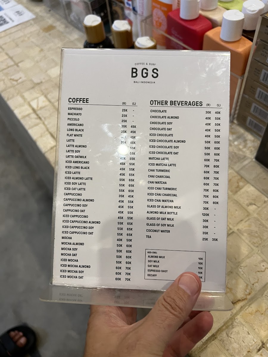 “ A quick coffee boost after a sun-soaked session at Nyang Nyang Beach, and BGS is the perfect choice for today! BGS Uluwatu—a coffee shop, or as they say, a surf shop complemented by a coffee joint. I've frequented their Canggu spot before, and now it's time to check out the Uluwatu branch. As always, I went for the trusty Iced Black and couldn't resist their famous Latte Almond. No need to rave about their coffee—it's great. And their staff? Love them! Also eyeing their CHPO sunglasses collection; thank goodness I can order them online, as I'm not sure when I'll be back at BGS in the soonest time. ”